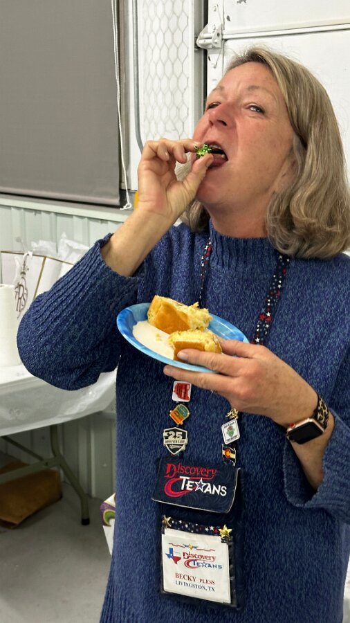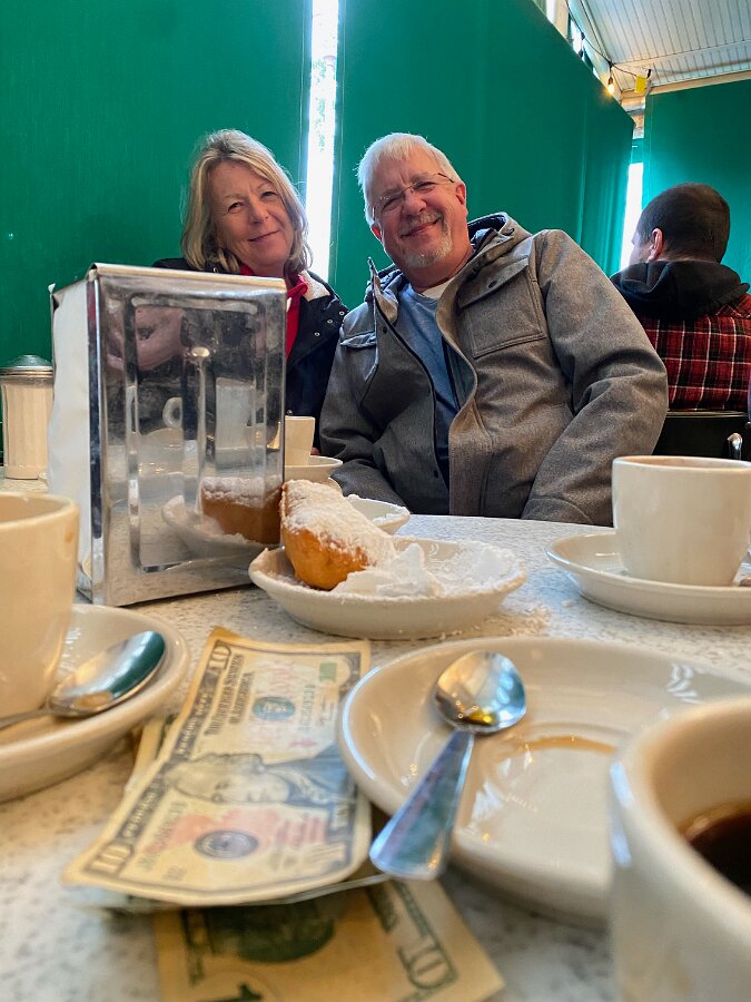 ![Becky enjoying her beignet at Cafe du Monde in NOLA]()